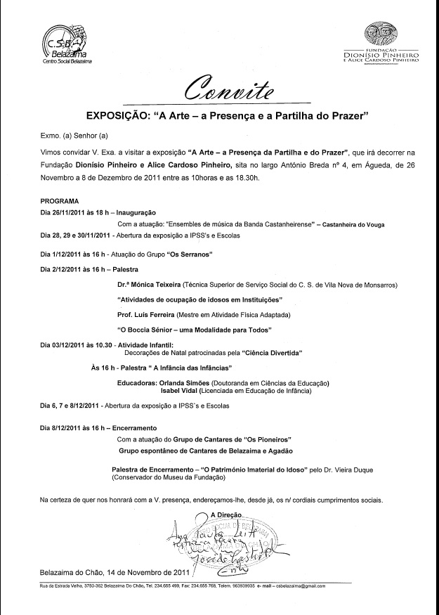 “Arte – A presença e a partilha do prazer”, trabalhos do Centro Social de Belazaima, na “Sala Águeda – multiusos” da Fundação Dionísio Pinheiro e Alice Cardoso Pinheiro, Águeda, de 26 de Novembro a 08 de Dezembro.