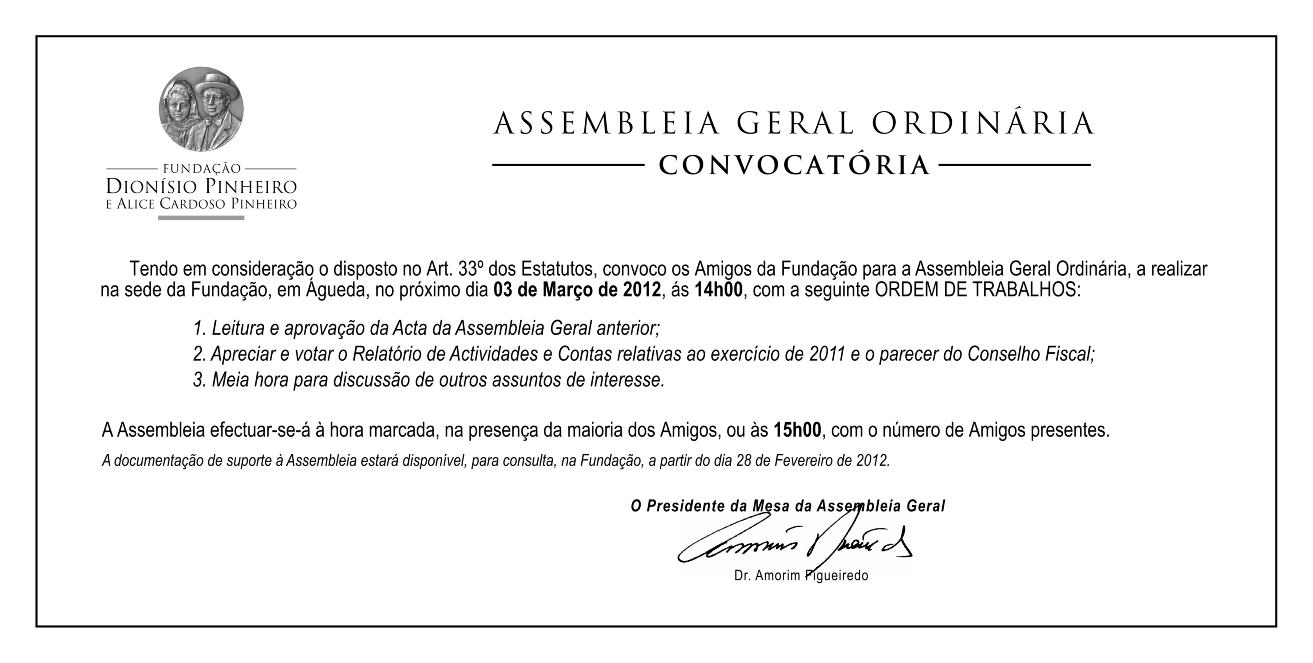Convoca-se os Amigos da Fundação para a Assembleia Geral Ordinária, a realizar na sede da Fundação, em Águeda, no proximo dia 3 de Março, às 14h00.